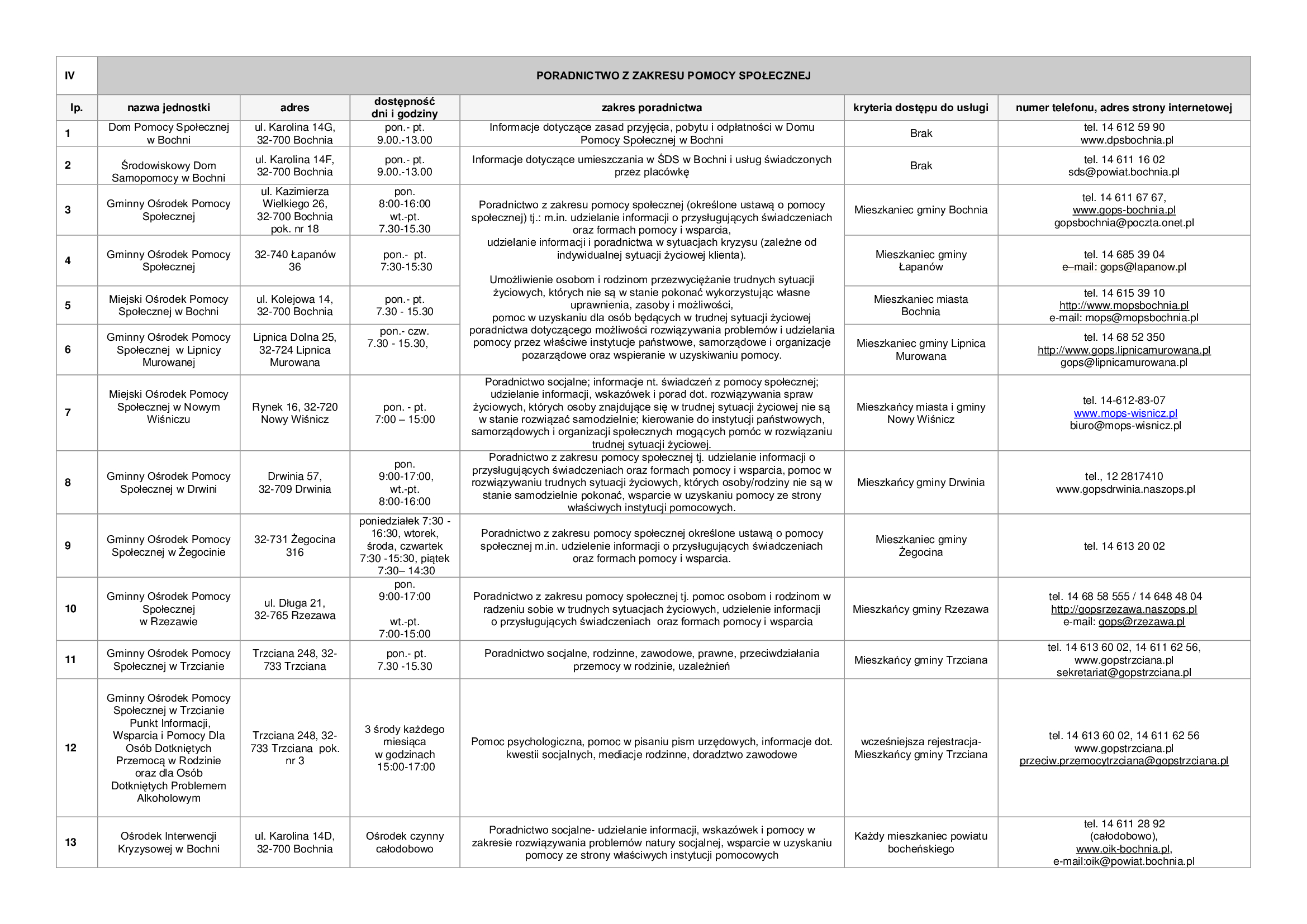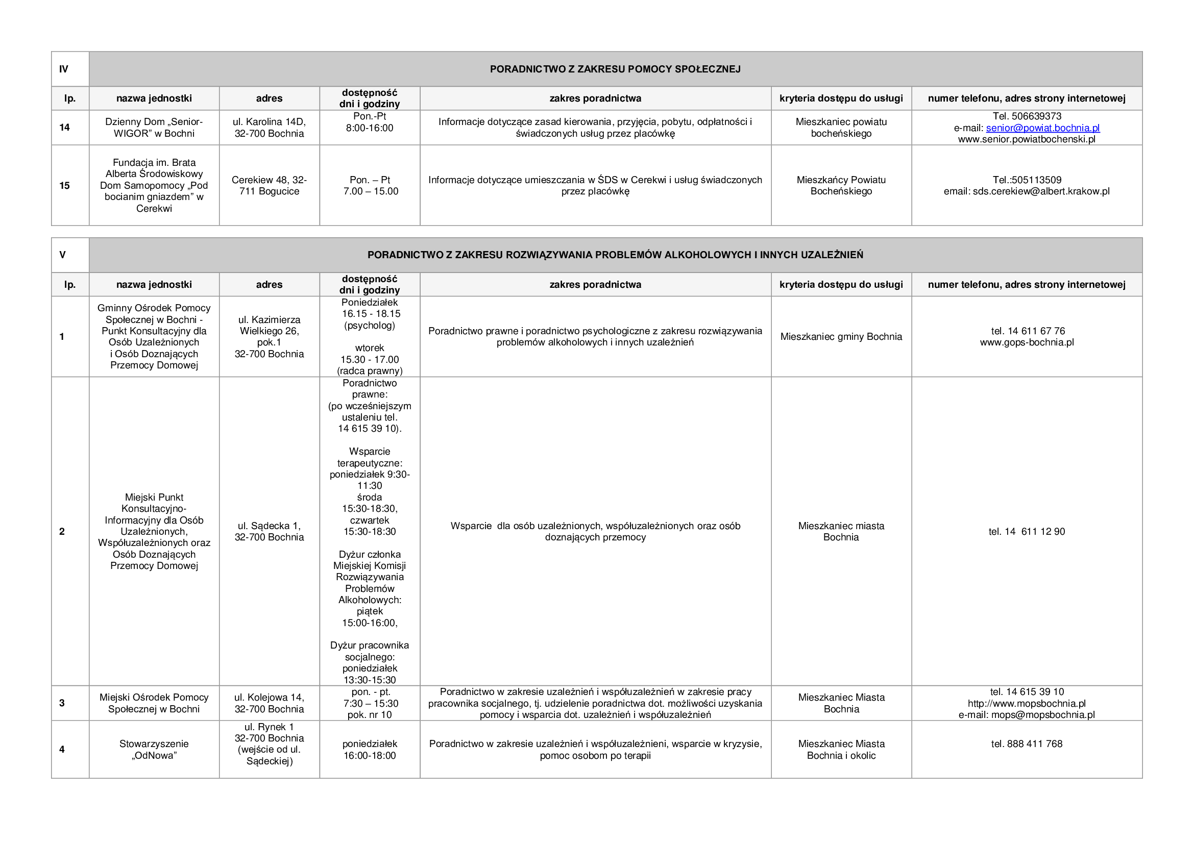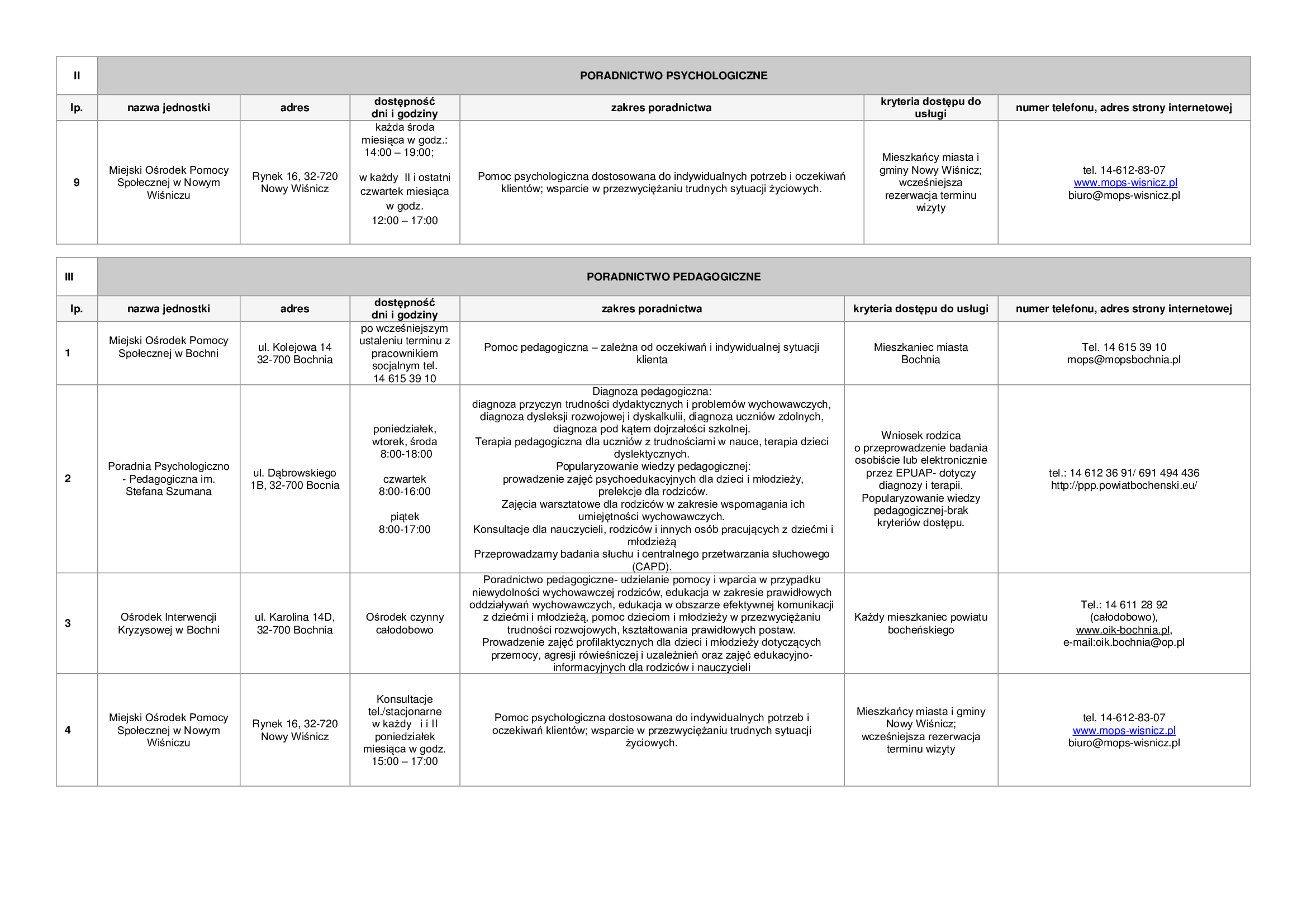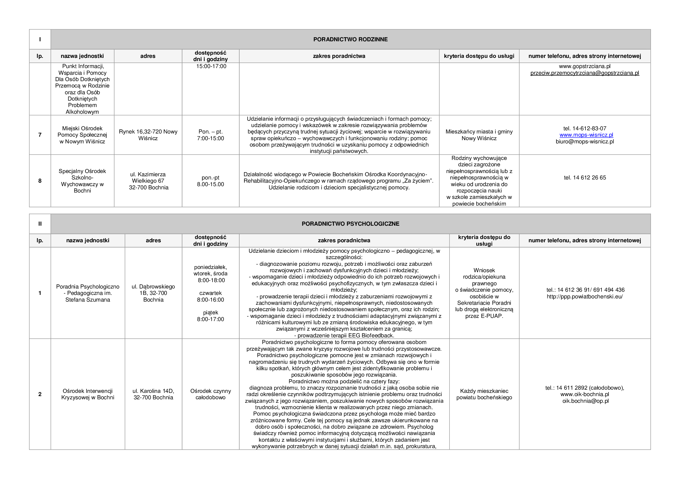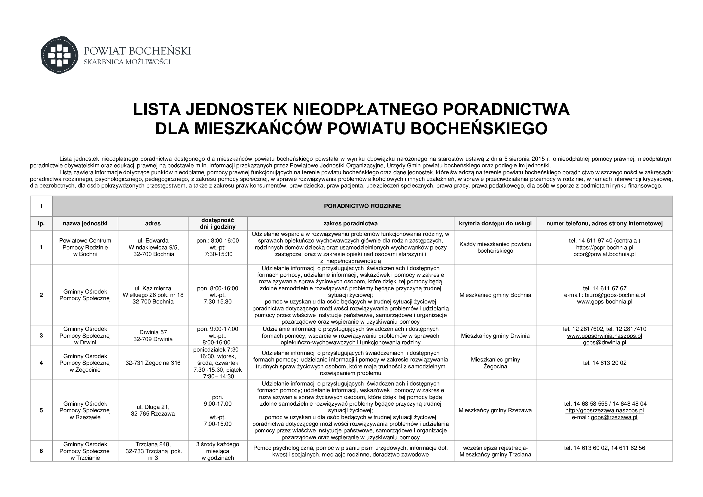 Lista zawiera informacje dotyczące punktów nieodpłatnej pomocy prawnej funkcjonujących na terenie powiatu bocheńskiego oraz dane jednostek, które świadczą na terenie powiatu bocheńskiego poradnictwo w szczególności w zakresach: poradnictwa rodzinnego, psychologicznego, pedagogicznego, z zakresu pomocy społecznej, w sprawie rozwiązywania problemów alkoholowych i innych uzależnień, w sprawie przeciwdziałania przemocy w rodzinie, w ramach interwencji kryzysowej, dla bezrobotnych, dla osób pokrzywdzonych przestępstwem, a także z zakresu praw konsumentów, praw dziecka, praw pacjenta, ubezpieczeń społecznych, prawa pracy, prawa podatkowego, dla osób w sporze z podmiotami rynku finansowego.