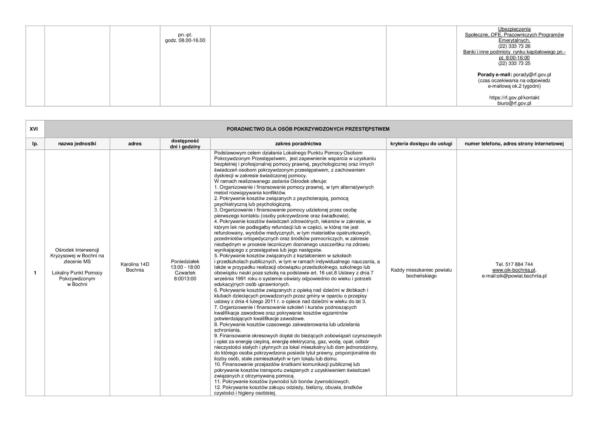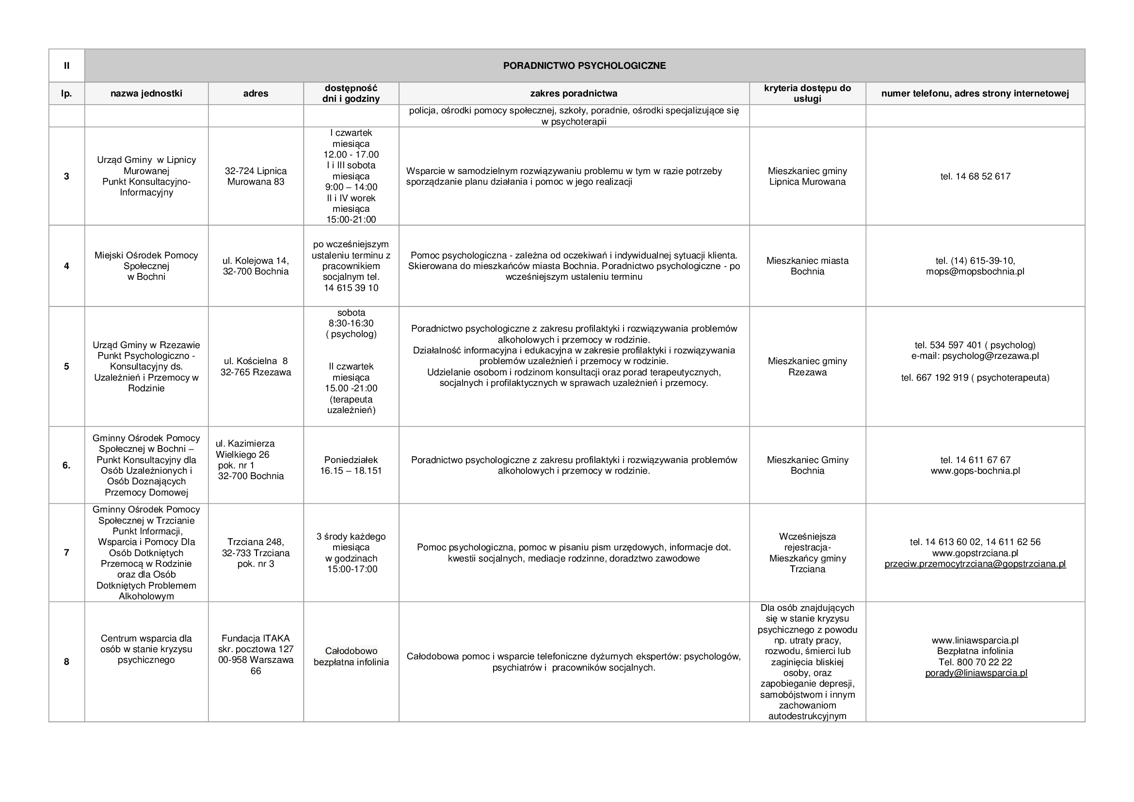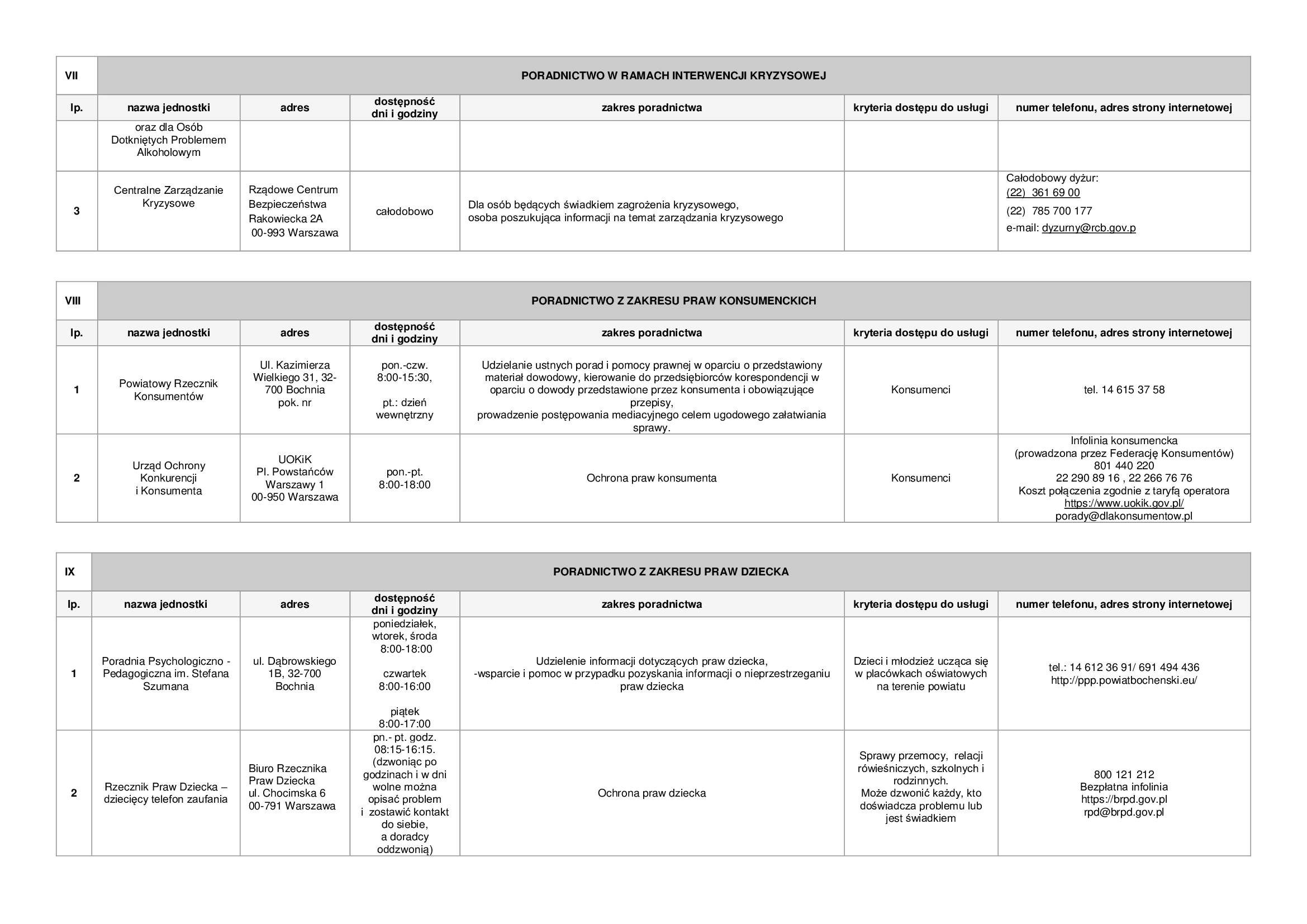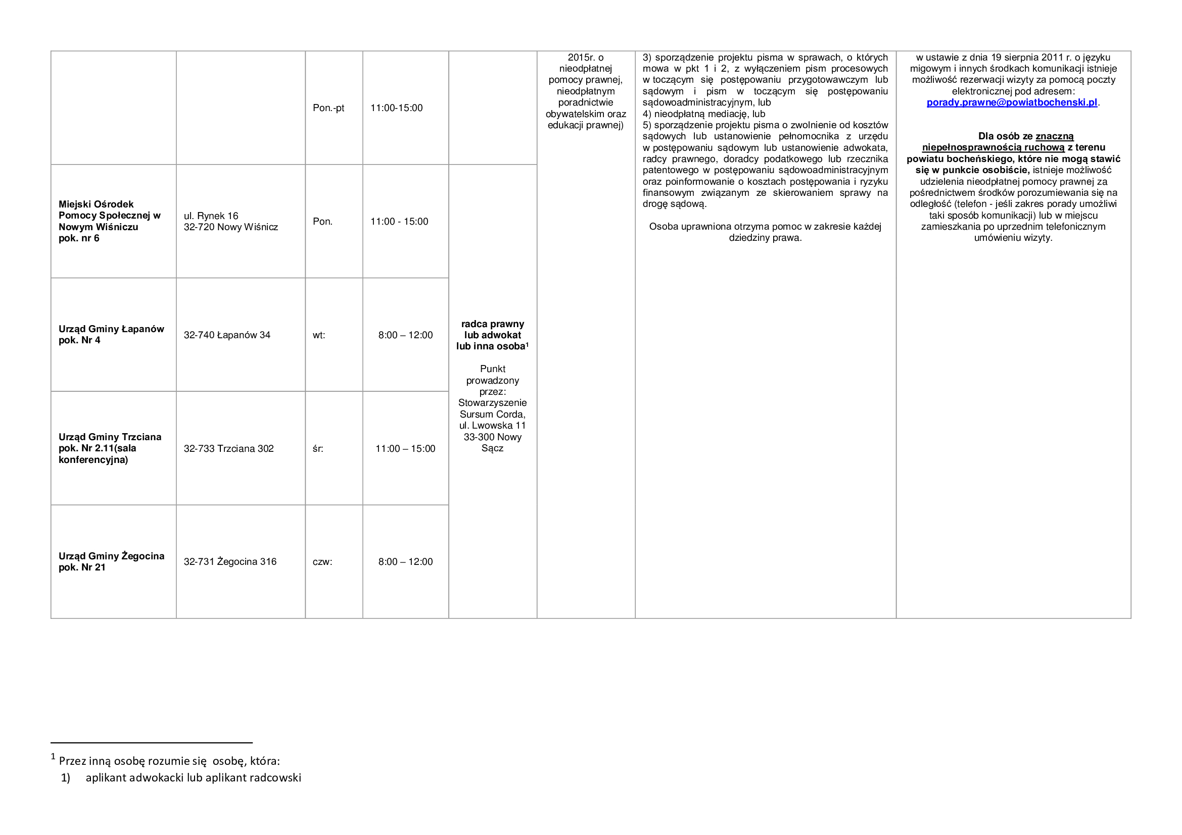 Lista zawiera informacje dotyczące punktów nieodpłatnej pomocy prawnej funkcjonujących na terenie powiatu bocheńskiego oraz dane jednostek, które świadczą na terenie powiatu bocheńskiego poradnictwo w szczególności w zakresach: poradnictwa rodzinnego, psychologicznego, pedagogicznego, z zakresu pomocy społecznej, w sprawie rozwiązywania problemów alkoholowych i innych uzależnień, w sprawie przeciwdziałania przemocy w rodzinie, w ramach interwencji kryzysowej, dla bezrobotnych, dla osób pokrzywdzonych przestępstwem, a także z zakresu praw konsumentów, praw dziecka, praw pacjenta, ubezpieczeń społecznych, prawa pracy, prawa podatkowego, dla osób w sporze z podmiotami rynku finansowego.