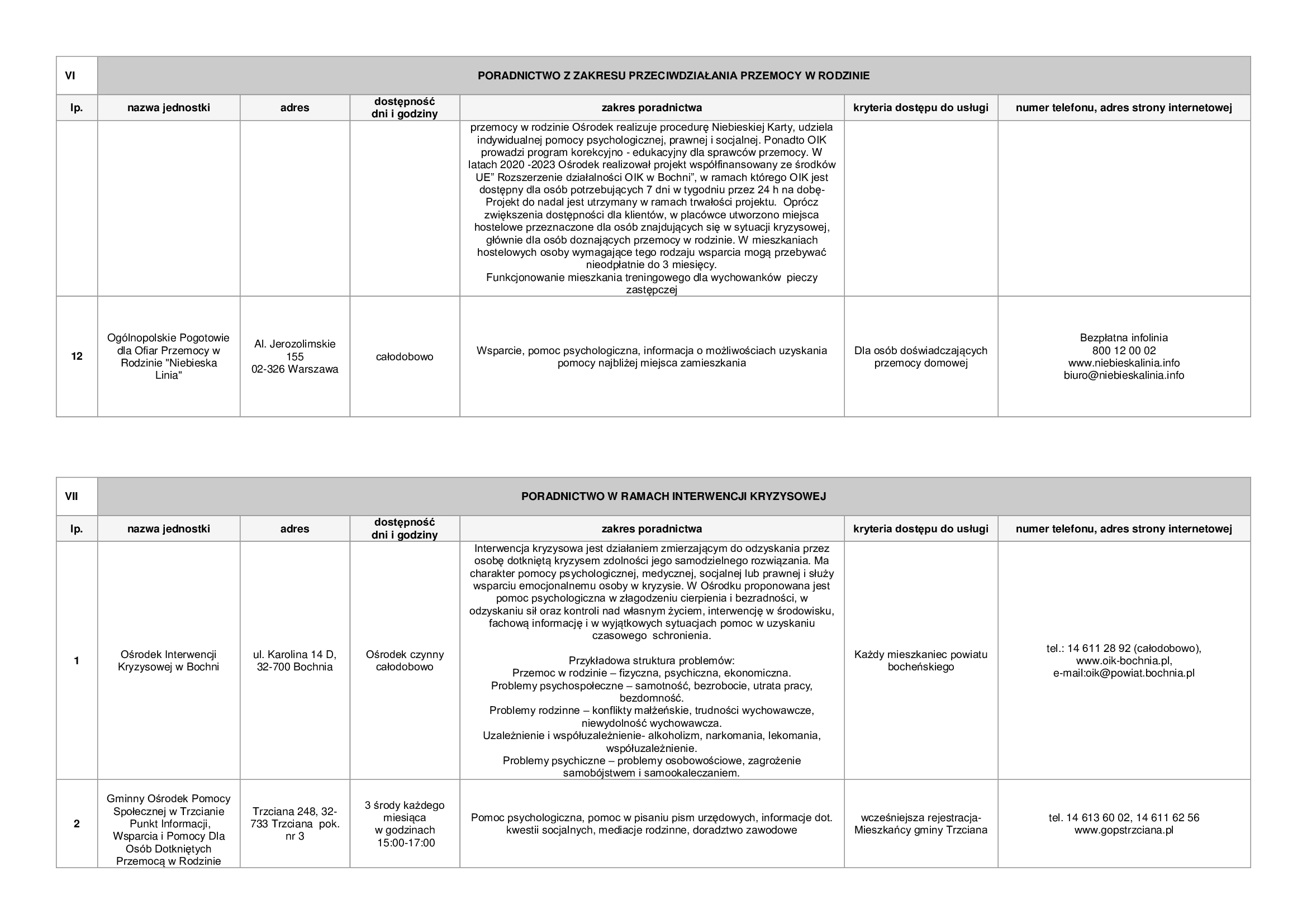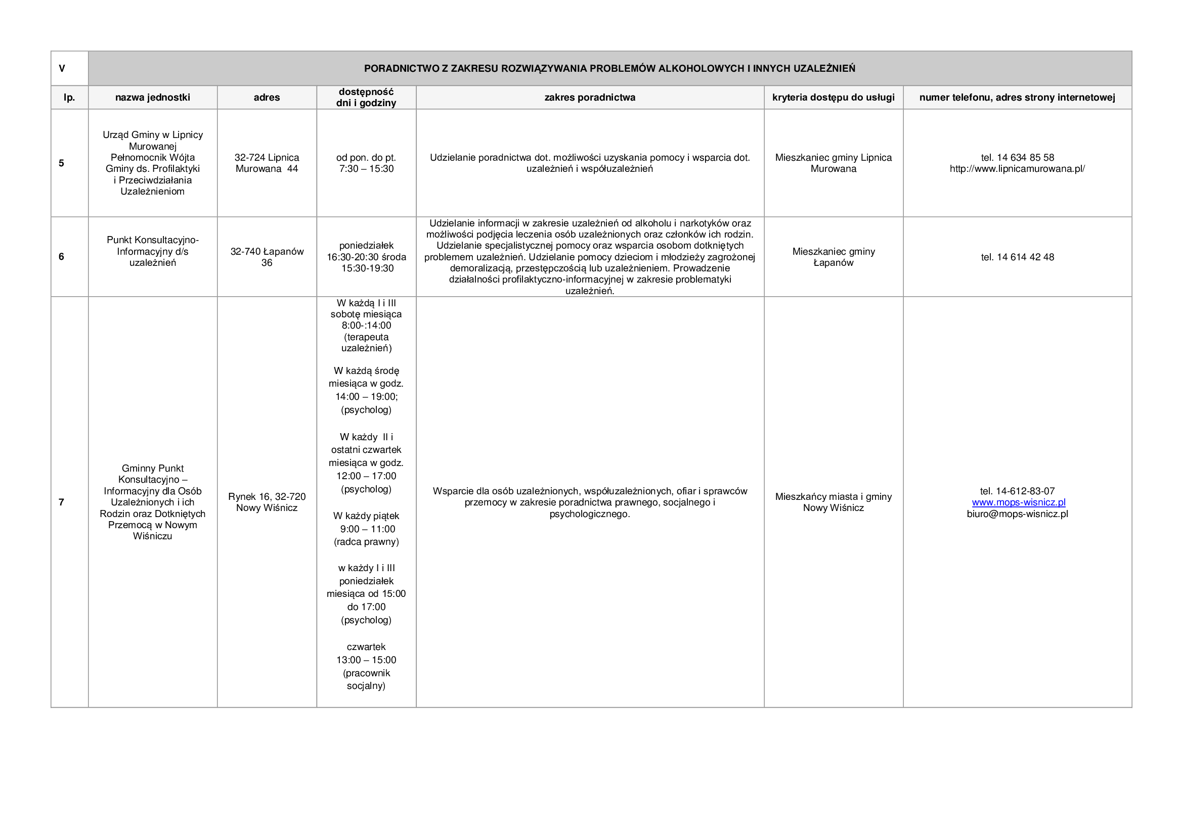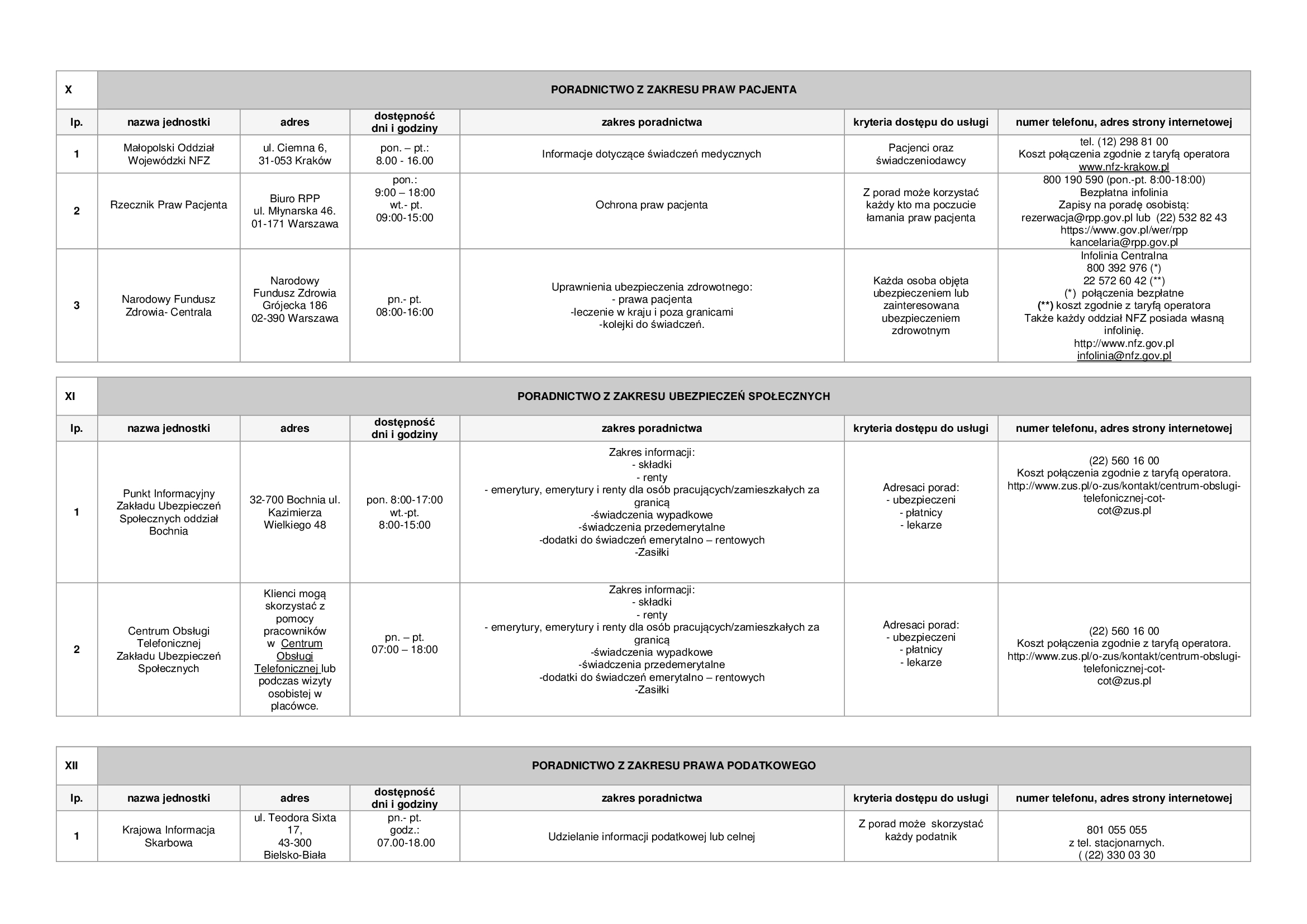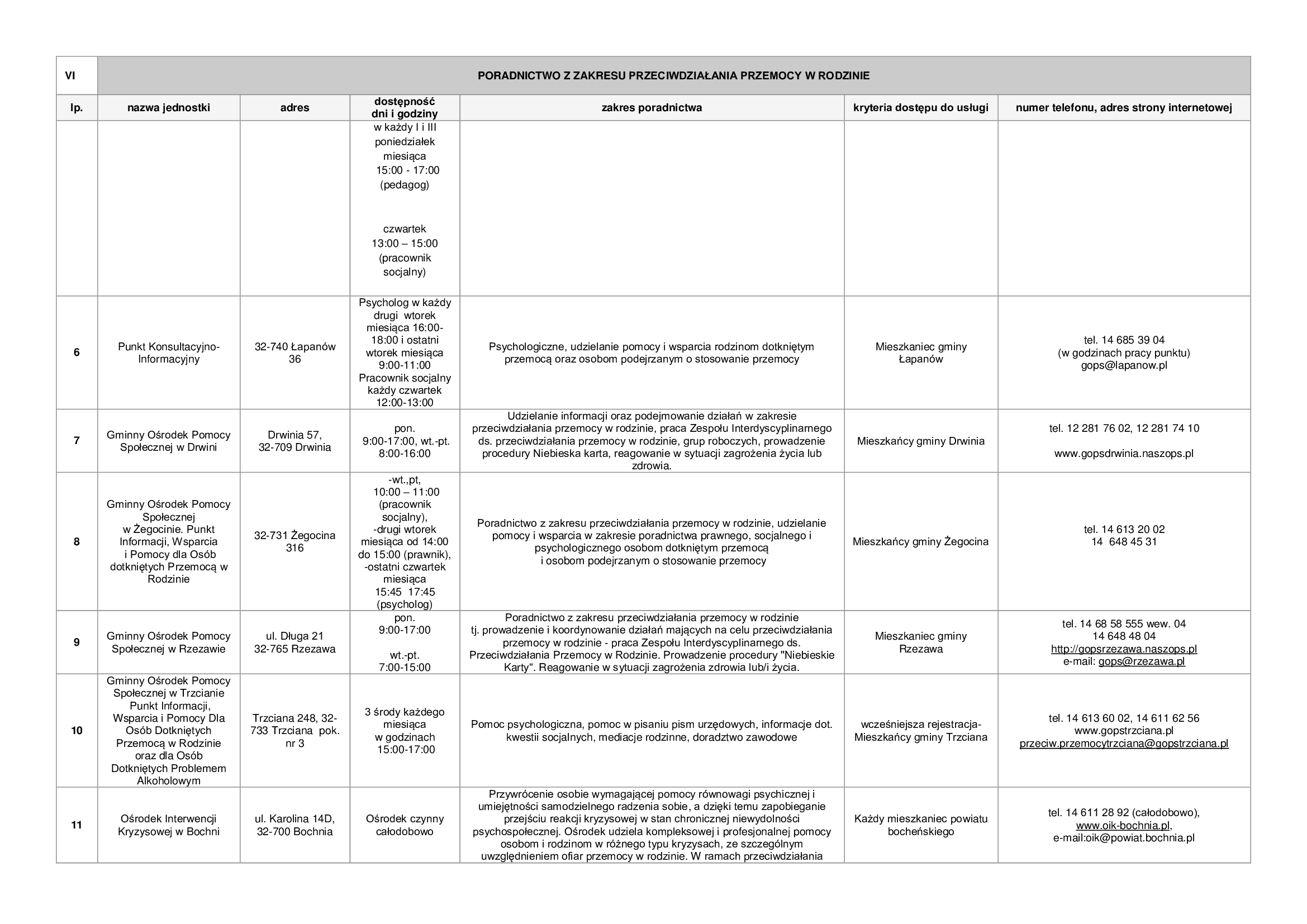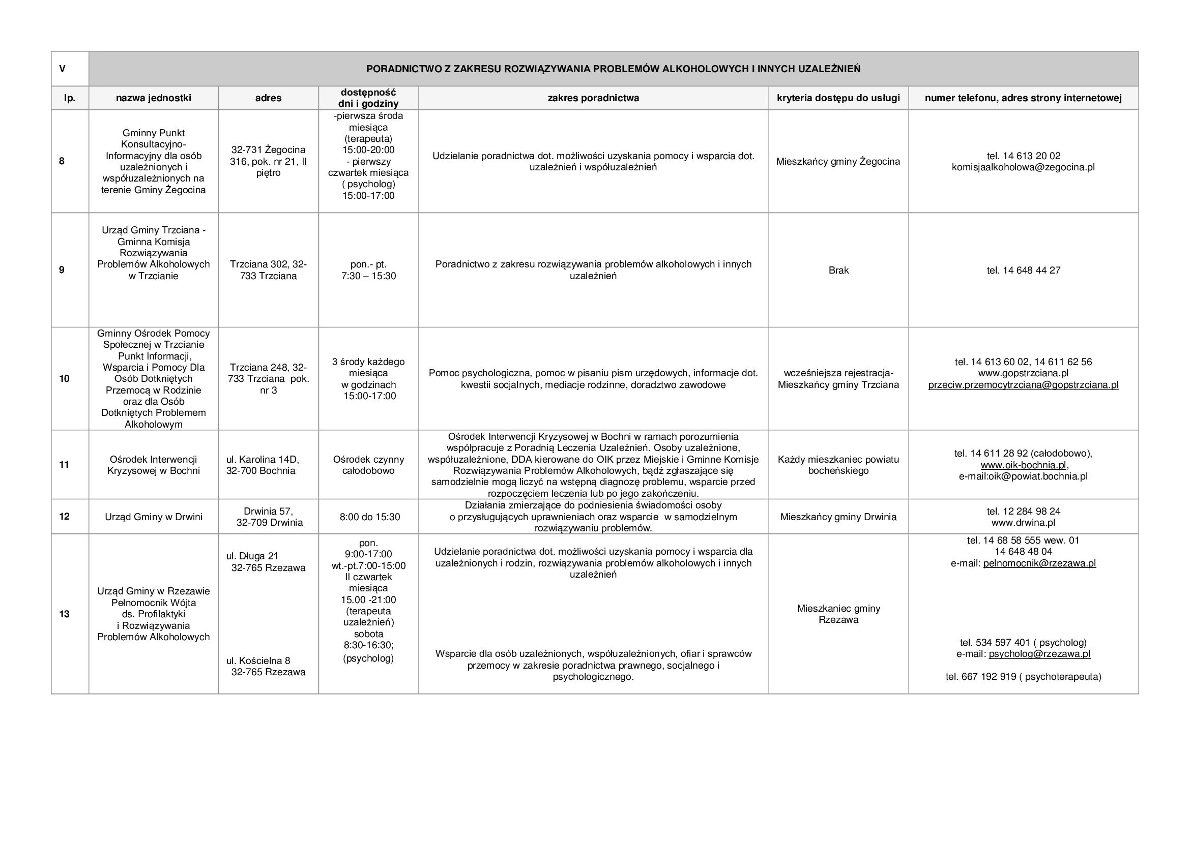 Lista zawiera informacje dotyczące punktów nieodpłatnej pomocy prawnej funkcjonujących na terenie powiatu bocheńskiego oraz dane jednostek, które świadczą na terenie powiatu bocheńskiego poradnictwo w szczególności w zakresach: poradnictwa rodzinnego, psychologicznego, pedagogicznego, z zakresu pomocy społecznej, w sprawie rozwiązywania problemów alkoholowych i innych uzależnień, w sprawie przeciwdziałania przemocy w rodzinie, w ramach interwencji kryzysowej, dla bezrobotnych, dla osób pokrzywdzonych przestępstwem, a także z zakresu praw konsumentów, praw dziecka, praw pacjenta, ubezpieczeń społecznych, prawa pracy, prawa podatkowego, dla osób w sporze z podmiotami rynku finansowego.