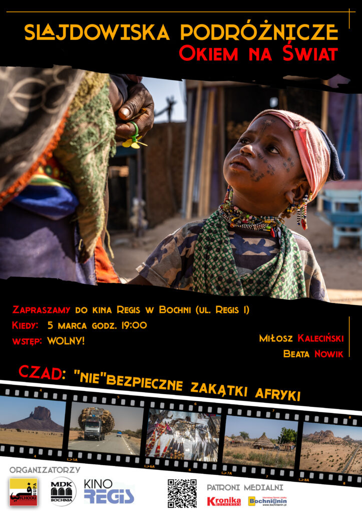Trzecie spotkanie podróżnicze z cyklu „Okiem na Świat” w Kinie Regis odbędzie się w dużej sali kinowej 5 marca o godz. 19.00. Po podróżach do Pakistanu i Namibii cykl „Okiem na Świat” zabiera uczestników w kolejne miejsce, które zdecydowanie nie należy do oczywistych kierunków turystycznych. Tym razem będzie to Czad – jeden z najrzadziej odwiedzanych krajów Afryki. Dla porównania: statystycznie więcej Europejczyków co roku staje na szczycie Mount Everestu, niż decyduje się na wyjazd do Czadu.