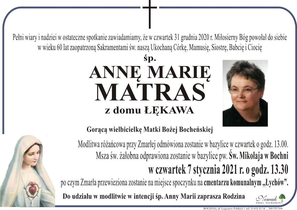 ś.p. Anna Maria Matras Małgorzata Więcek-Cebula Dodano 04 stycznia 2021 18:47 Share Tweet Share Share Email Komentarzy - REKLAMA - Tagi: Share Tweet Share Share Email - REKLAMA -