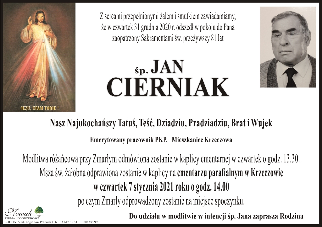 ś.p. Jan Cierniak Małgorzata Więcek-Cebula Dodano 04 stycznia 2021 16:46 Share Tweet Share Share Email Komentarzy - REKLAMA - Tagi: Share Tweet Share Share Email - REKLAMA -