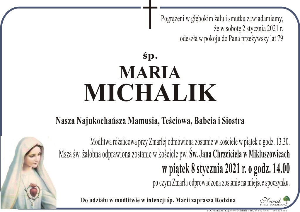 ś.p. Maria Michalik Małgorzata Więcek-Cebula Dodano 05 stycznia 2021 21:33 Share Tweet Share Share Email Komentarzy - REKLAMA - Tagi: Share Tweet Share Share Email - REKLAMA -
