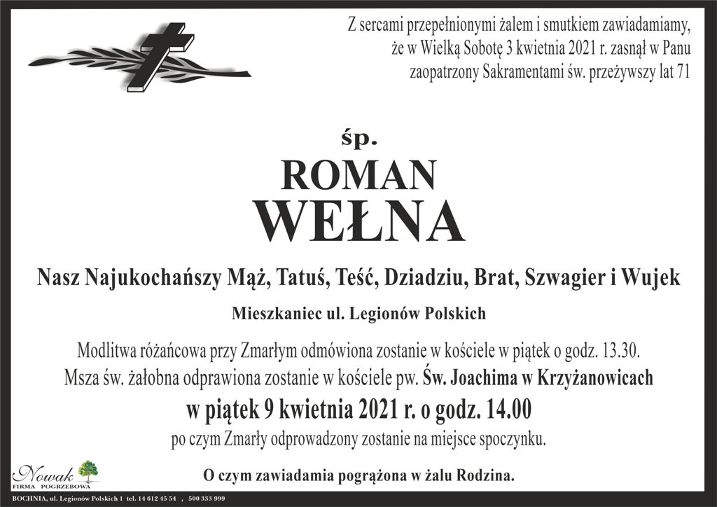 ś.p. Roman Wełna Małgorzata Więcek-Cebula Dodano 07 kwietnia 2021 06:16 Share Tweet Share Share Email Komentarzy Tagi: Share Tweet Share Share Email - REKLAMA -