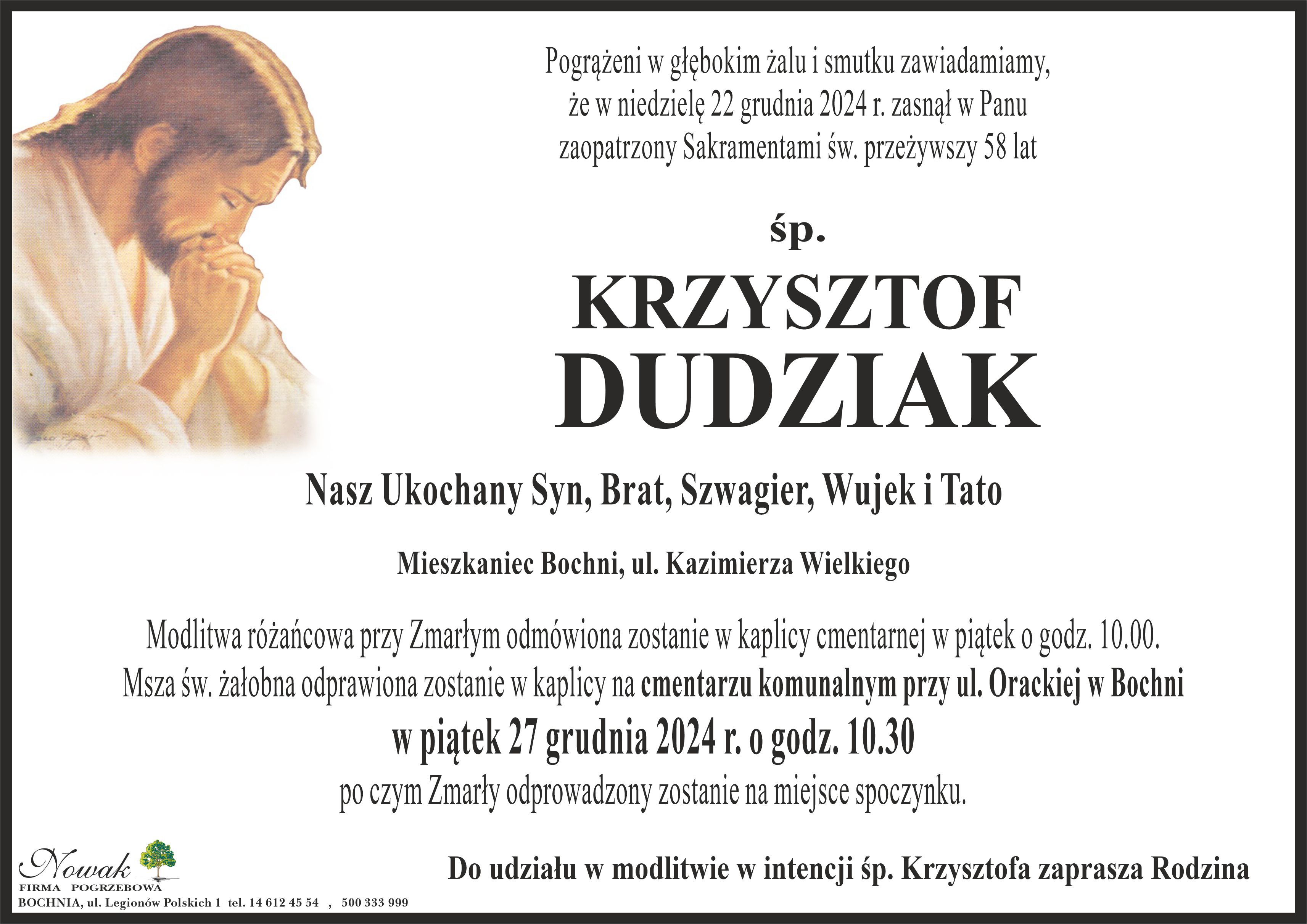 śp. Krzysztof Dudziak Małgorzata Więcek-Cebula Dodano 27 grudnia 2024 08:29 Share Tweet Share Share Email Komentarzy Tagi: Share Tweet Share Share Email - REKLAMA -