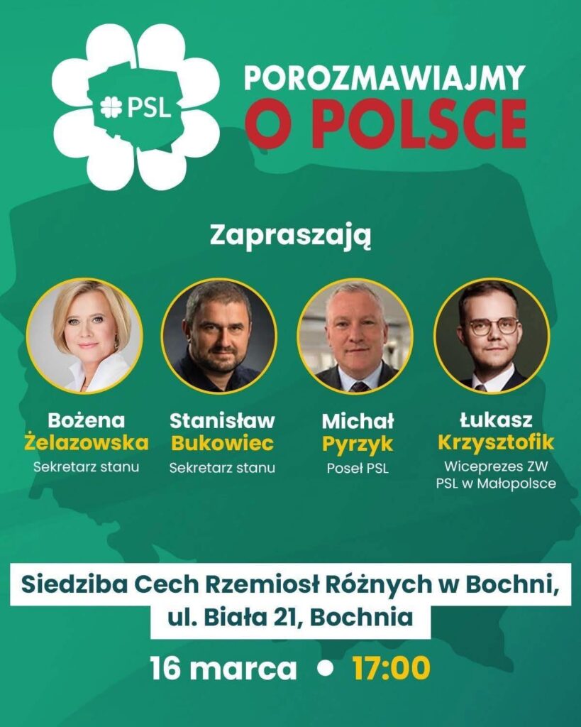 Na godz. 17.00 w budynku Cechy Rzemiosł Różnych zaplanowano kolejne spotkanie z cyklu #PorozmawiajmyoPolsce. W wydarzeniu wezmą udział: Stanisław Bukowiec Sekretarz Stanu w Ministerstwie Infrastruktury, Bożena Żelazowska – Poseł na Sejm RP – wiceminister kultury i dziedzictwa narodowego, Michał Pyrzyk – poseł na Sejm RP, Łukasz Krzysztofik – dyrektor Biura Wojewody Małopolskiego.
