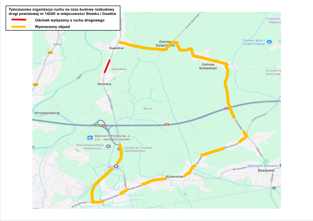 W związku z prowadzonymi pracami przy rozbudowie drogi powiatowej w Gawłowie, nastąpi całkowite zamknięcie drogi dla ruchu na odcinku od cmentarza (od posesji nr 133) w kierunku Bochni (do posesji nr 127). Zamknięty fragment ma długość około 400 metrów. Utrudnienia potrwają od 30 października do 6 listopada 2025 r.
