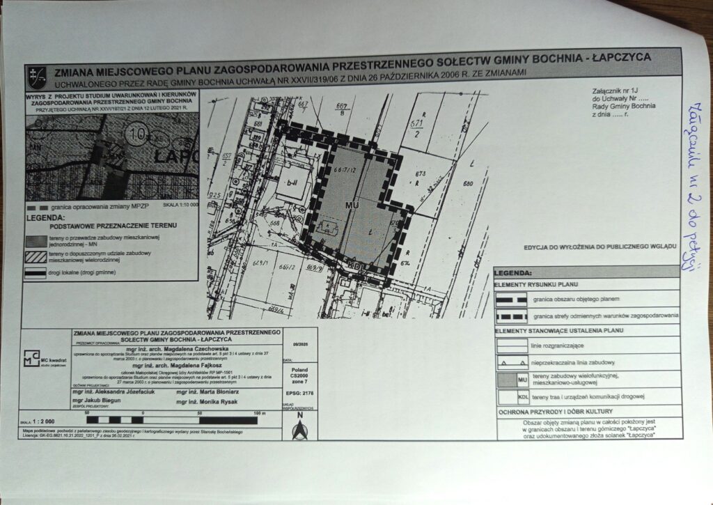 Niniejszym składamy petycję o korektę w/w projektu planu w zakresie przytoczonej w projekcie planu strefy odmiennych zasad zagospodarowania na działkach nr 667/10, 667/12, 1467/4, 1467/7 w Łapczycy, na terenie której założono tereny o przeznaczeniu MU (mieszkaniowo – usługowe) o dopuszczonym udziale zabudowy mieszkaniowej wielorodzinnej (budynki wielorodzinne do 12m wysokości– wg zapisu §2, pkt 8b projektu uchwały Rady Gminy Bochnia w sprawie: zmiany miejscowego planu zagospodarowania przestrzennego sołectw Gminy Bochnia – projekt uchwały stanowi załącznik do niniejszej petycji)