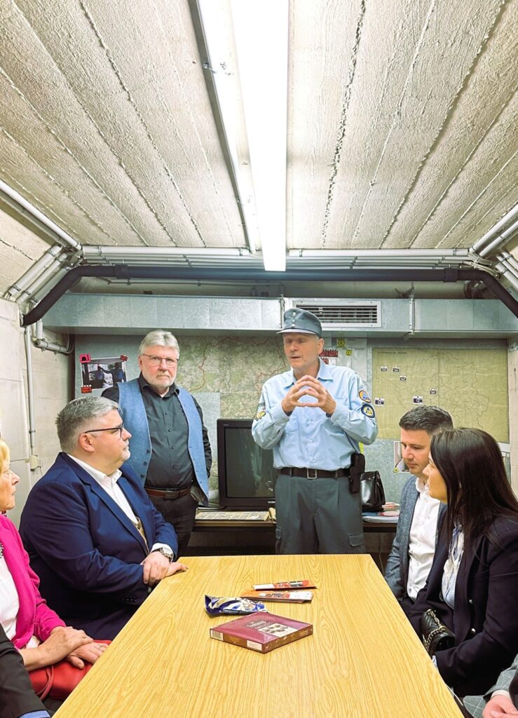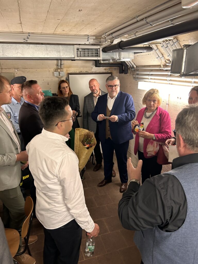 Delegacja miała również okazję zapoznać się z rozwiązaniami w zakresie ochrony ludności, odwiedzając m.in. schron znajdujący się w budynku starostwa powiatowego, który pełni funkcję miejsca kierowania sztabu kryzysowego.