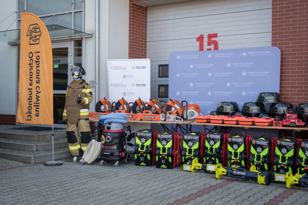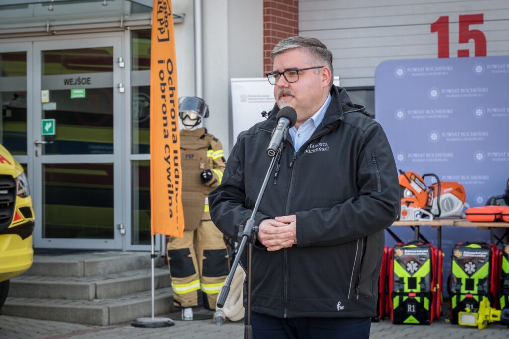 W Komendzie Powiatowej Państwowej Straży Pożarnej w Bochni odbyła się dziś oficjalna prezentacja sprzętu zakupionego w ramach Programu Ochrony Ludności i Obrony Cywilnej. Dzięki pozyskanym środkom służby z terenu Powiatu Bocheńskiego zostały doposażone w nowoczesne pojazdy i specjalistyczne wyposażenie, które zwiększy ich możliwości reagowania w sytuacjach zagrożenia. Łącznie do służb z Powiatu Bocheńskiego trafiło blisko 7 mln zł. Ponad 3,2 mln zł otrzymał bezpośrednio samorząd powiatowy, natomiast ponad 3,6 mln zł przeznaczono na doposażenie Komendy Powiatowej Państwowej Straży Pożarnej w Bochni w nowe pojazdy.