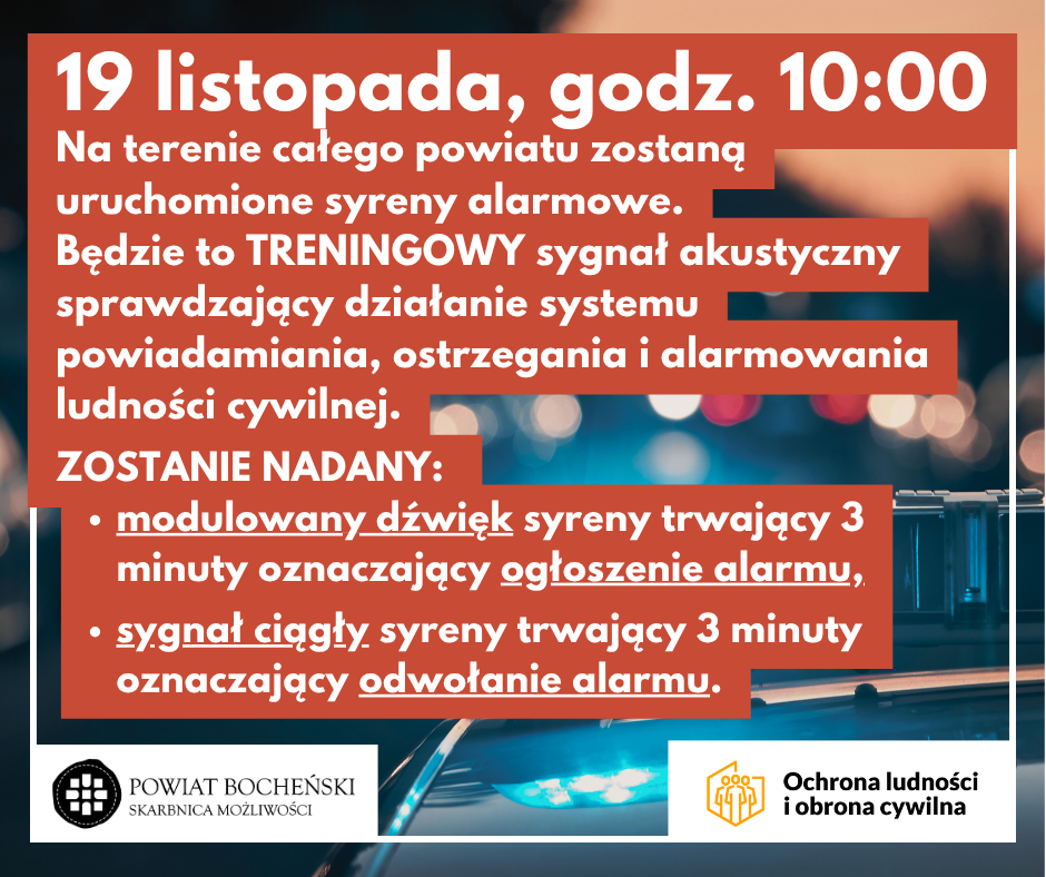 W związku z realizacją ćwiczeń, w środę 19 listopada 2025 r. o godz. 10.00 na terenie całego powiatu zostaną uruchomione syreny alarmowe. Będzie to testowy sygnał akustyczny w ramach treningu systemu powiadamiania, ostrzegania i alarmowania.